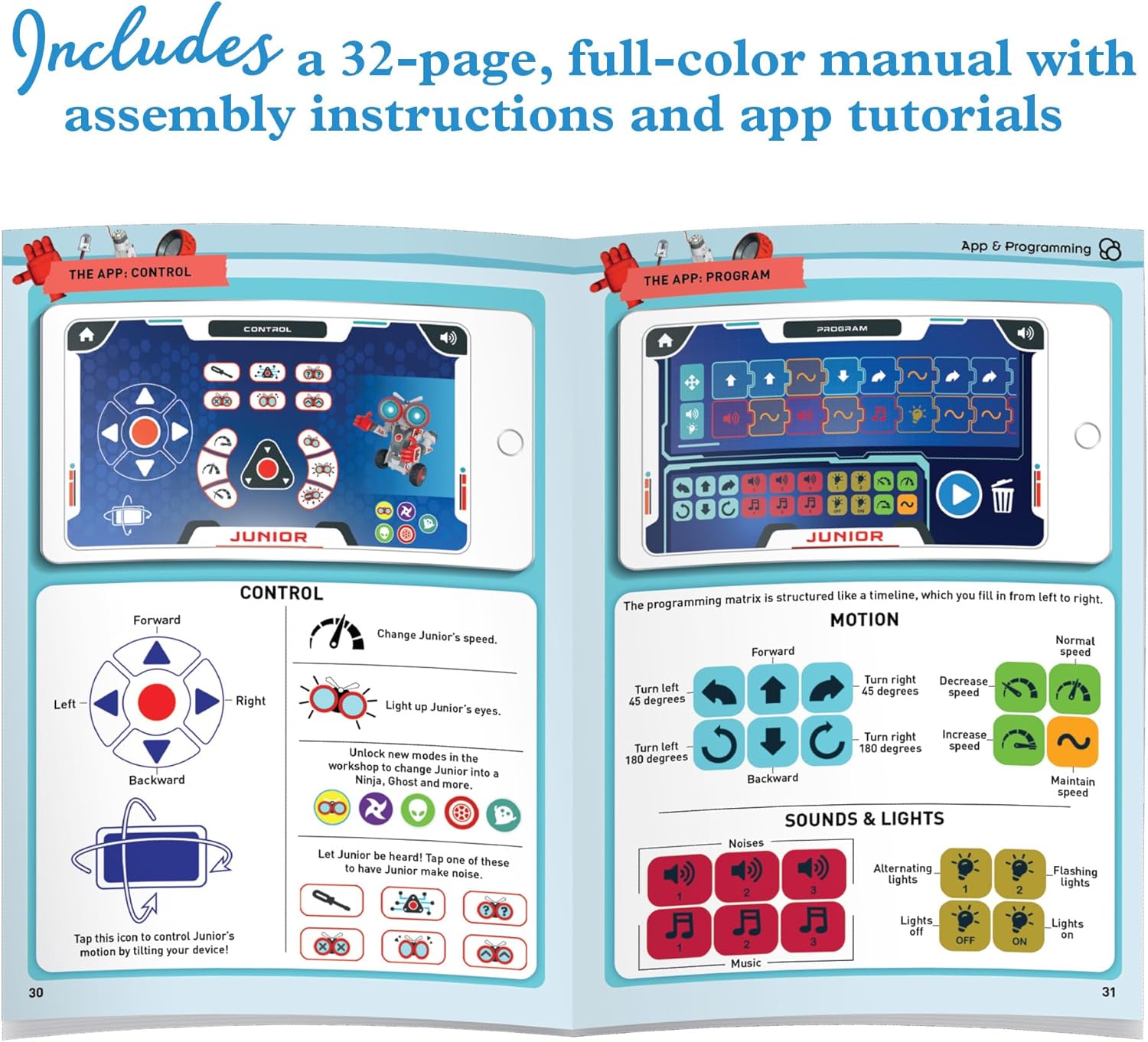 Build and program your own robotic pal with this simple, fun, and customizable introduction to robotics. Assemble the durable, plastic building pieces into a 9-inch tall bot, then pair it with the free app on your smart device to unlock all of Junior’s capabilities. You control Junior’s movements and sounds! Program its movements directly on a built-in keypad or use the easy, visual interface on the app. Drive it around by remote control or use your device as a gyroscope. Play a make-believe robot workshop game in the app to diagnose any onboard issues. Junior’s microcontroller (or “brain”) has separate inputs for the LED lights that light up its eyes, a speaker, two motors (left and right), and a battery. A full-color, 32-page step-by-step illustrated manual explains how Junior’s functions relate to each of these elements, walks kids through the construction process, and helps them make the most of the app’s features – all while teaching them about robotics in the real world. The app requires a tablet (recommended) or smartphone running iOS or Android. Please check the app stores for compatibility and device requirements.