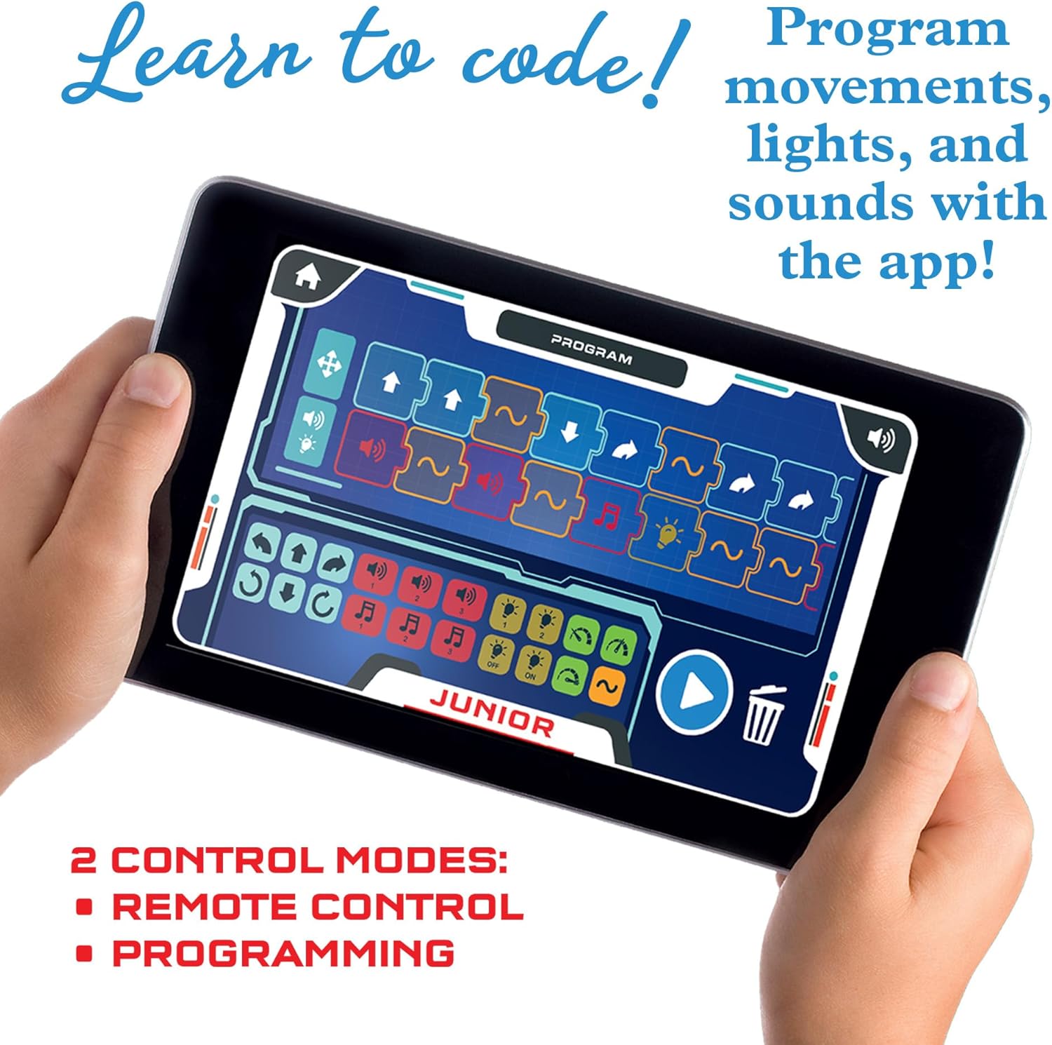 No complex coding skills required! Easy, block-based coding app programs up to 200 different actions.